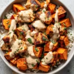 A comforting and nutritious rice bowl featuring roasted sweet potatoes, tender chicken, and fluffy rice, perfect for busy weeknights.