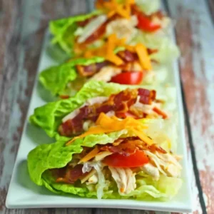 A delightful twist on a classic, this Keto & Low Carb Chicken Club Sandwich is packed with flavor, featuring lean grilled chicken, turkey bacon, fresh vegetables, and creamy mayonnaise, all wrapped in crisp lettuce.