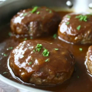A nostalgic and comforting dish featuring tender ground beef patties covered in rich gravy, perfect for weeknight dinners.